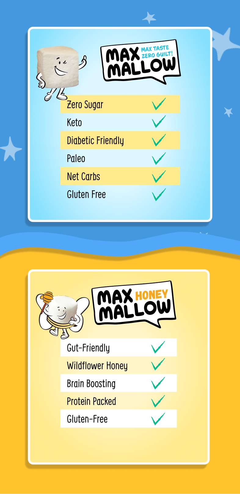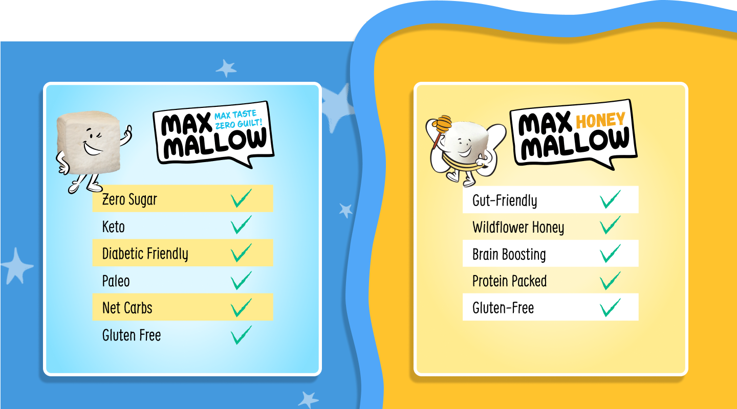 Vegan Vanilla Vegan Burnt Caramel Vegan Huckleberry Birthday Funfetti with glitter Classic Vanilla Lightning Vanilla Burnt Caramel Cinnamon Mint Chip Zero Sugar Dark Chocolate Chips. Max is your go-to solution for sugar free marshmallows that will satisfy rather than trigger cravings.