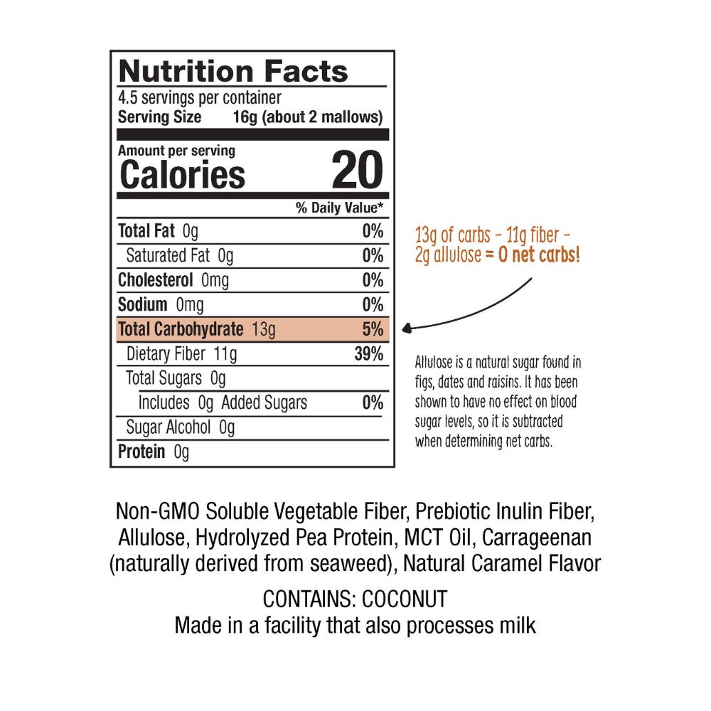 These snackworthy vegan marshmallows are packed with nutrition! Enjoy these sugar free vegan mallows in your cup of coffee, hot chocolate, as a snack, and in baking. Our vegan mallows have a firmer texture than our other mallows, and the caramel color of the allulose appears over time. It's chemistry and completely natural. They are deliciously satisfying.